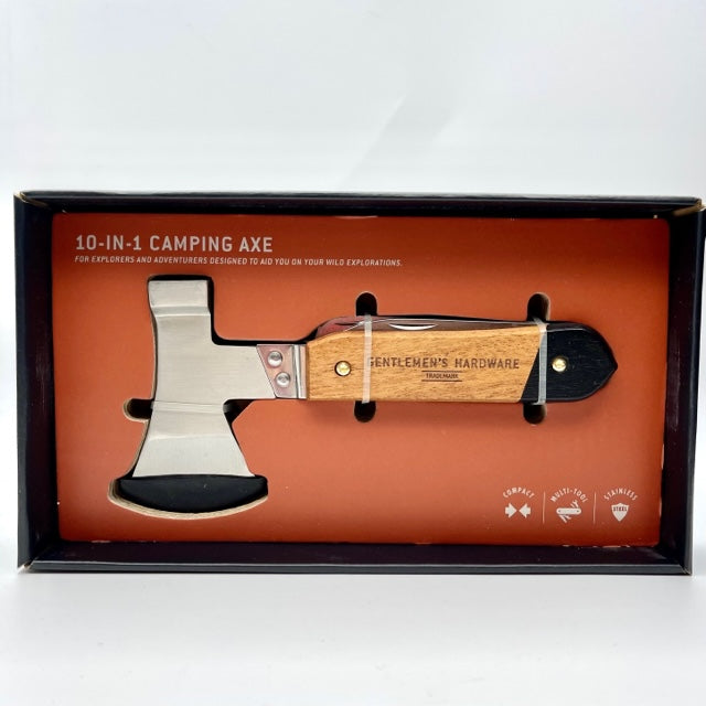 Cross Head Screwdriver, Kindling Axe, Mini Mallet, Bottle Opener, Can Opener, Saw, Knife, Saw, Flat head Screwdriver and File