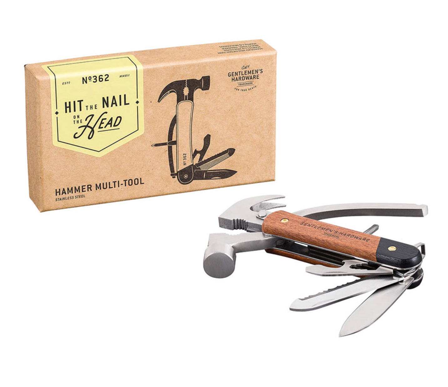 The take-anywhere hammer with some brilliant bonus tricks! The Hammer Multi-Tool features a claw hammer, pliers, screwdriver, bottle opener, knife, serrated knife and wire cutters all tucked in as invaluable extras. The multiple stainless steel tools fold out from the smooth branded wooden handles.