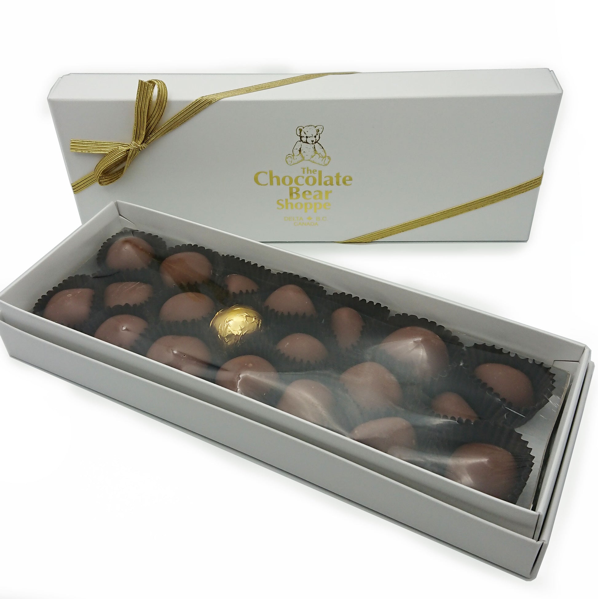 Pieces of candied ginger enrobed in milk chocolate. 225g.
