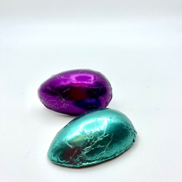 Milk Peanut Butter Egg, foiled in purple or teal colour